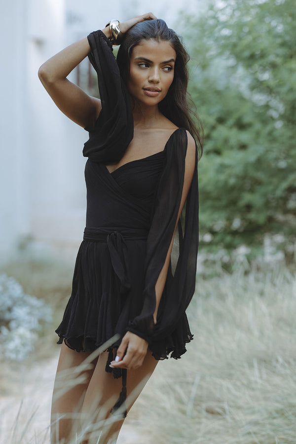 Con mangas abullonadas con aberturas, un diseño con espalda abierta y una falda corta, este vestido es todo lo que has estado buscando.